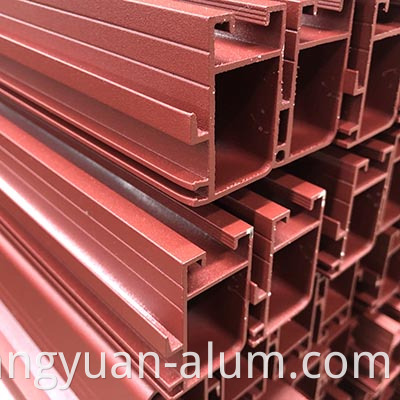 Lapisan serbuk disembur pada permukaan profil aluminium dengan peranti penyemburan serbuk elektrostatik. Di bawah tindakan elektrik statik, serbuk akan diserap secara seragam pada permukaan profil aluminium untuk membentuk salutan serbuk, pelbagai lapisan akhir. Kesan penyemburan jauh melebihi proses lukisan dari segi kekuatan mekanikal, lekatan, rintangan kakisan dan rintangan penuaan.