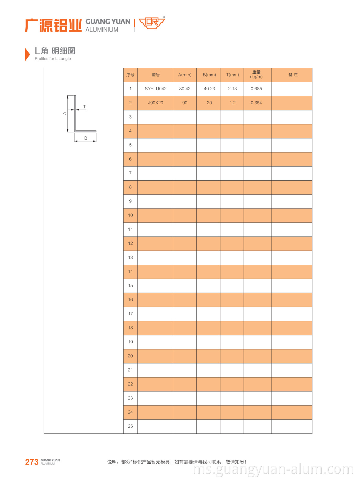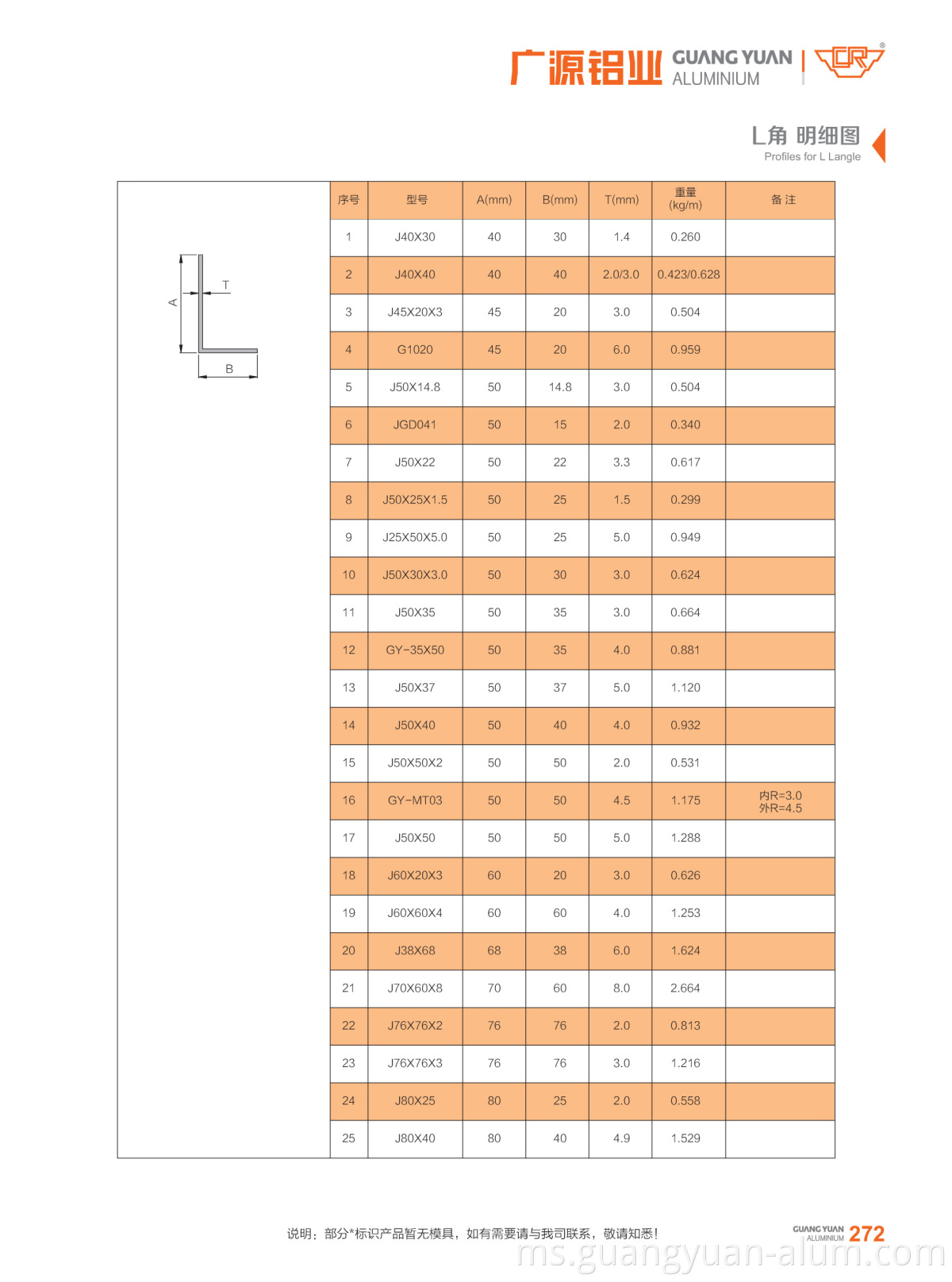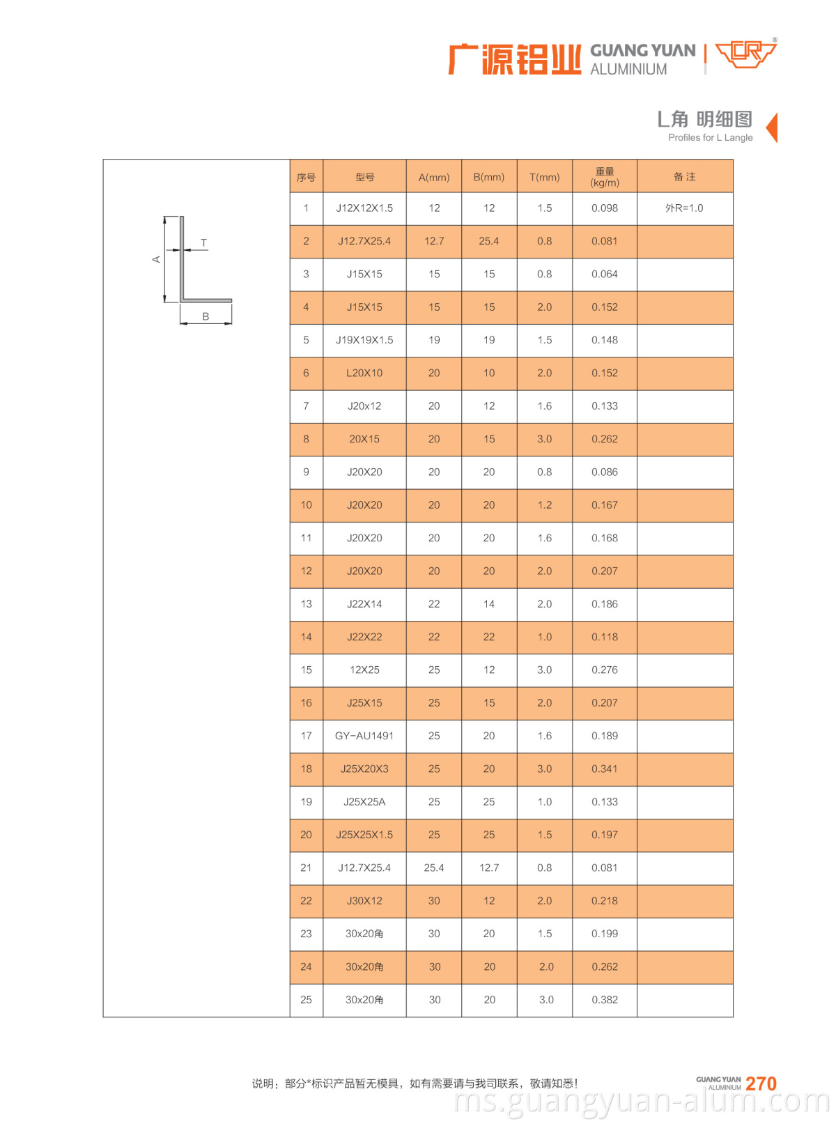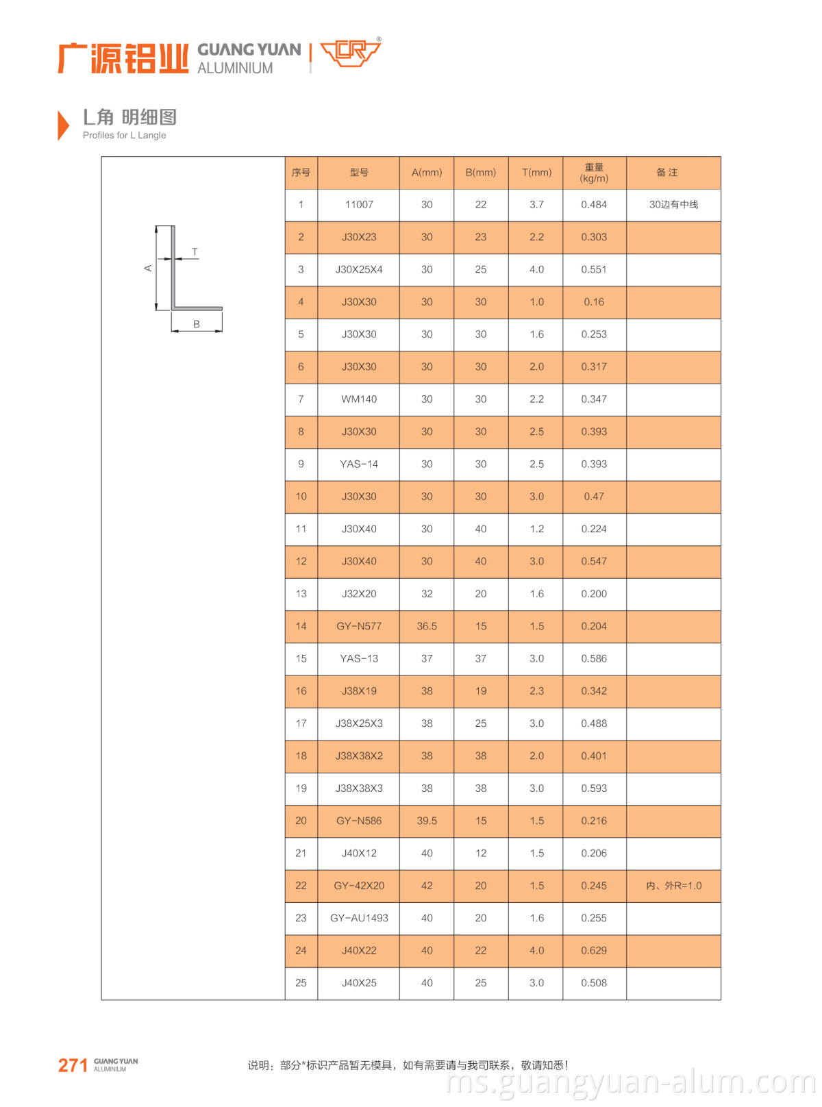 Guangyuan Aluminium Co., Ltd dilengkapi dengan aluminium L Extrusion 'mati, yang mempunyai julat ketebalan 1.0 mm hingga ketebalan 8.0 mm untuk pelanggan memilih. Sila lihat lukisan terperinci berikut untuk mengetahui keutamaan anda. Walaupun profil yang anda mahukan tidak ada dalam senarai dalam katalog kami, sebagai syarikat penyemperitan aluminium yang berpengalaman, kami fleksibel untuk menjadikan asas extrusions aluminium adat anda pada dimensi anda.